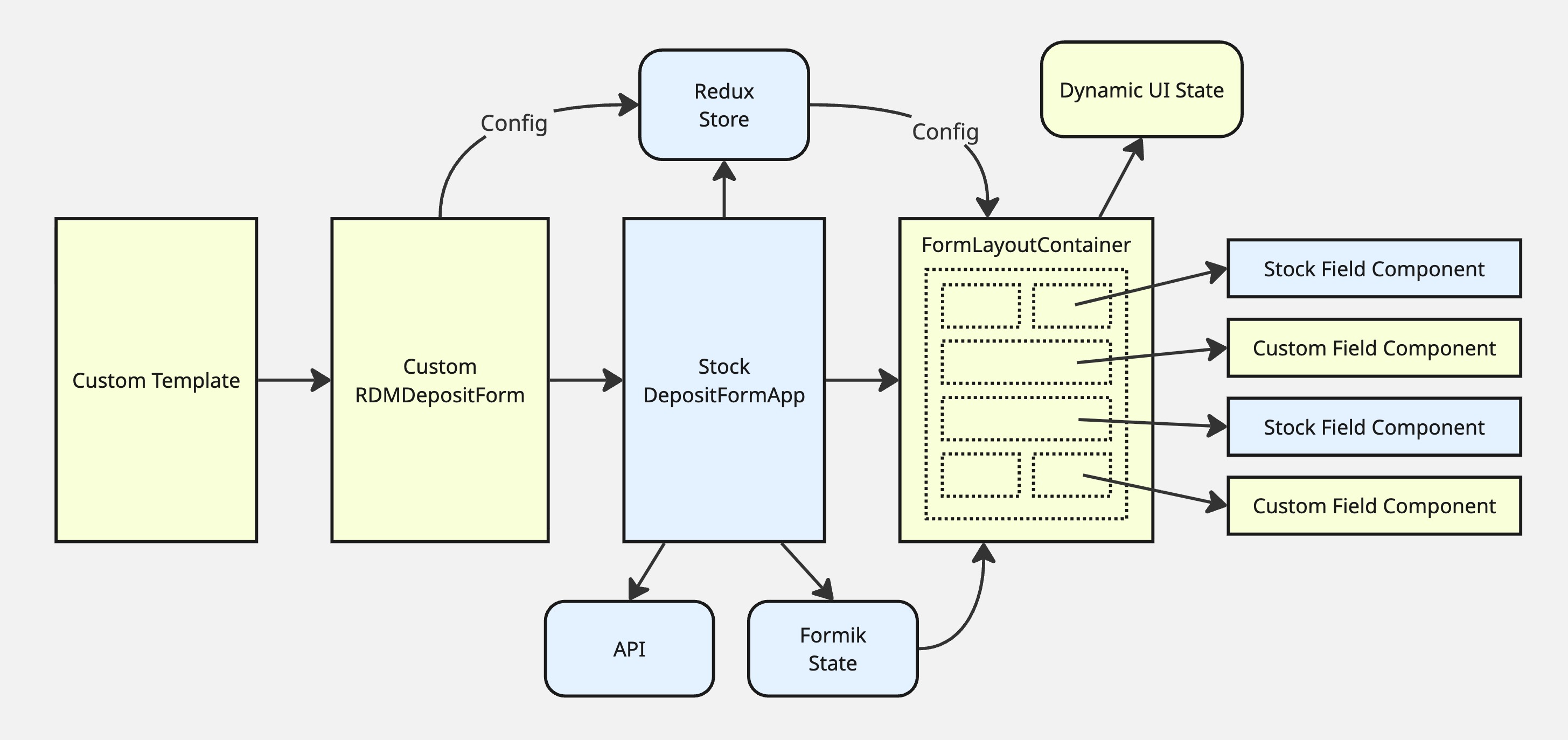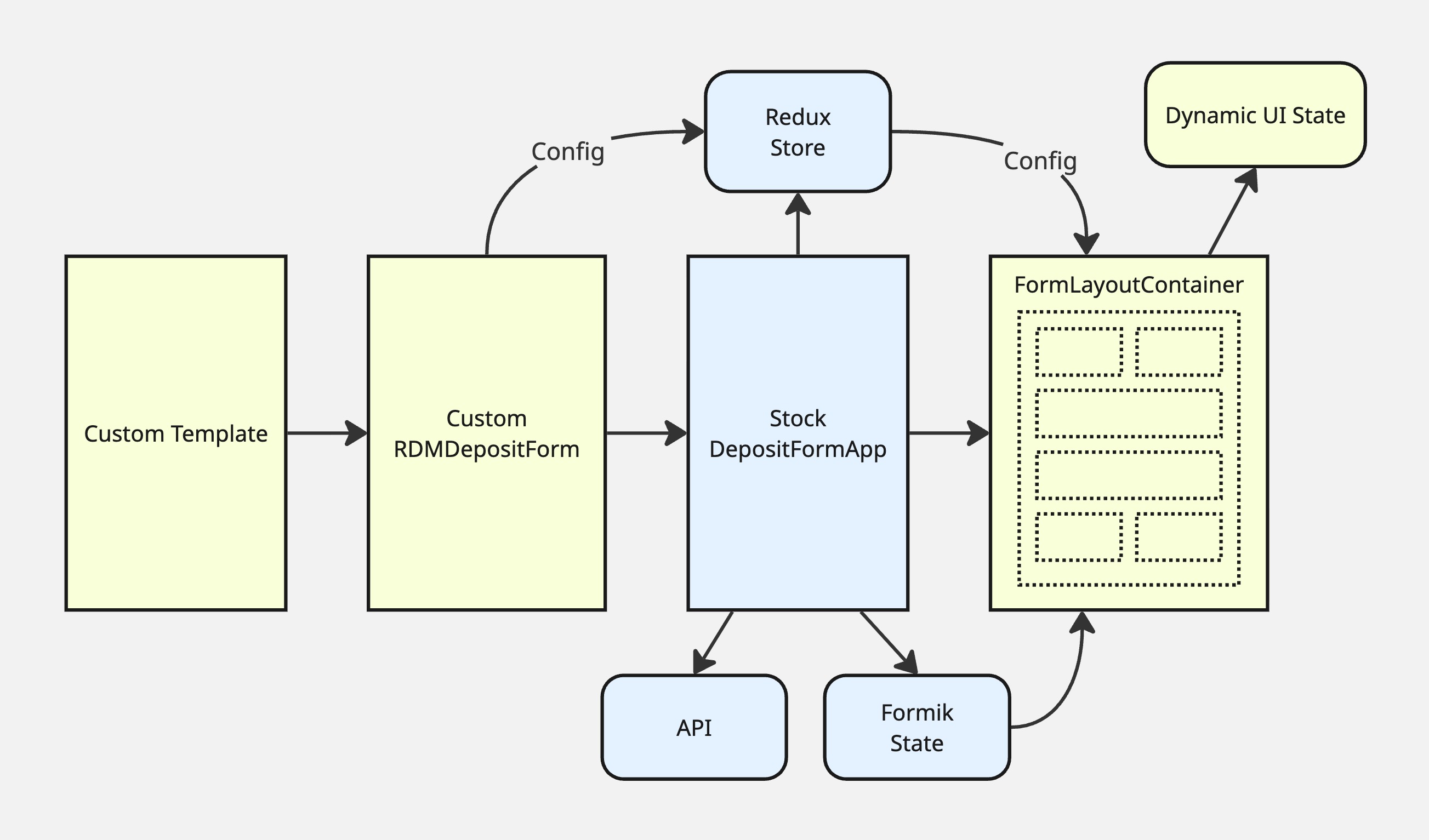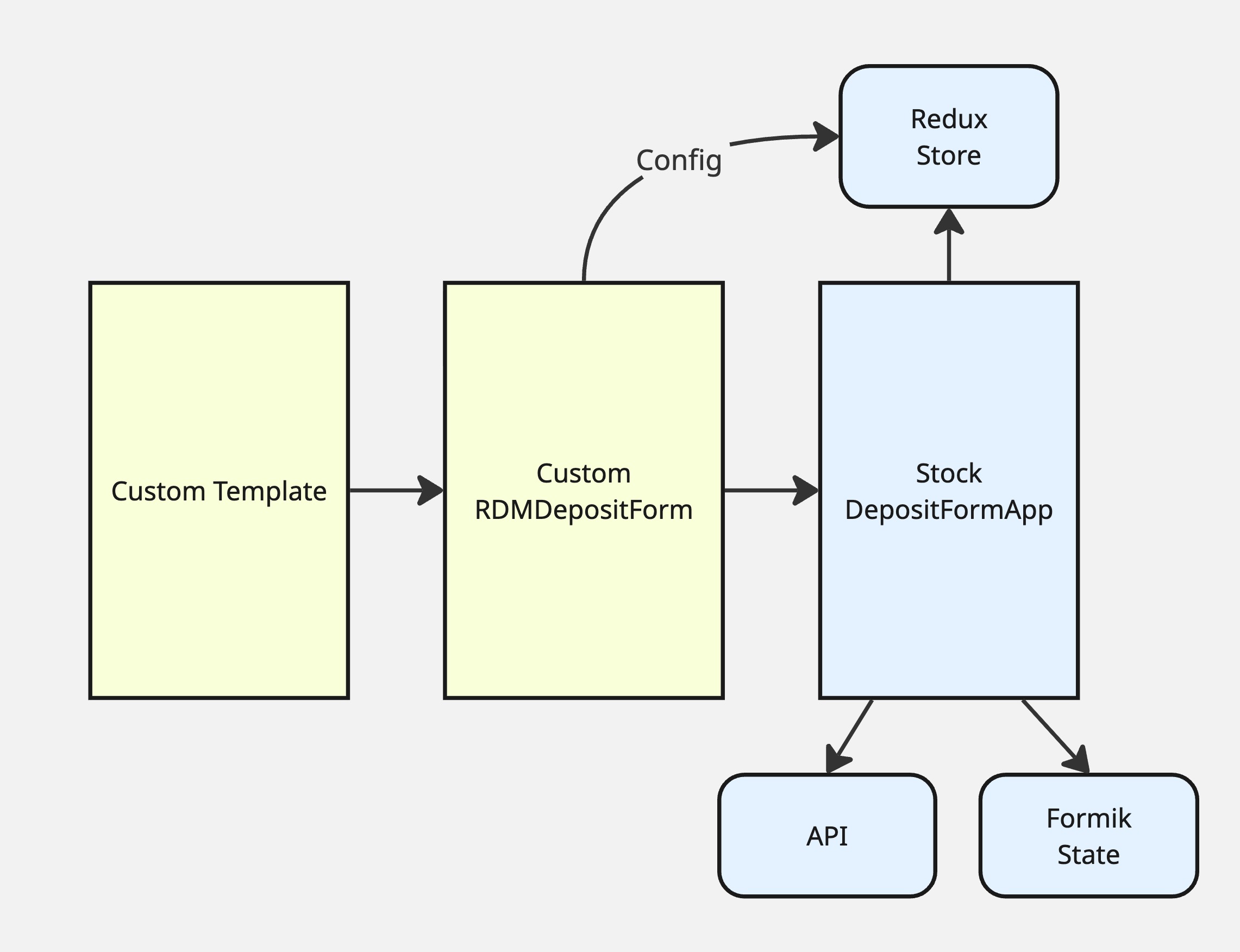 The package provides a custom Jinja template that renders a custom version of the top-level RDMDepositForm component. This is a thin wrapper that renders the stock DepositFormApp as its one child. The modular form layout and configuration are merged into the stock deposit form’s config data by the template (using a custom filter) and passed into the stock form’s Redux store.