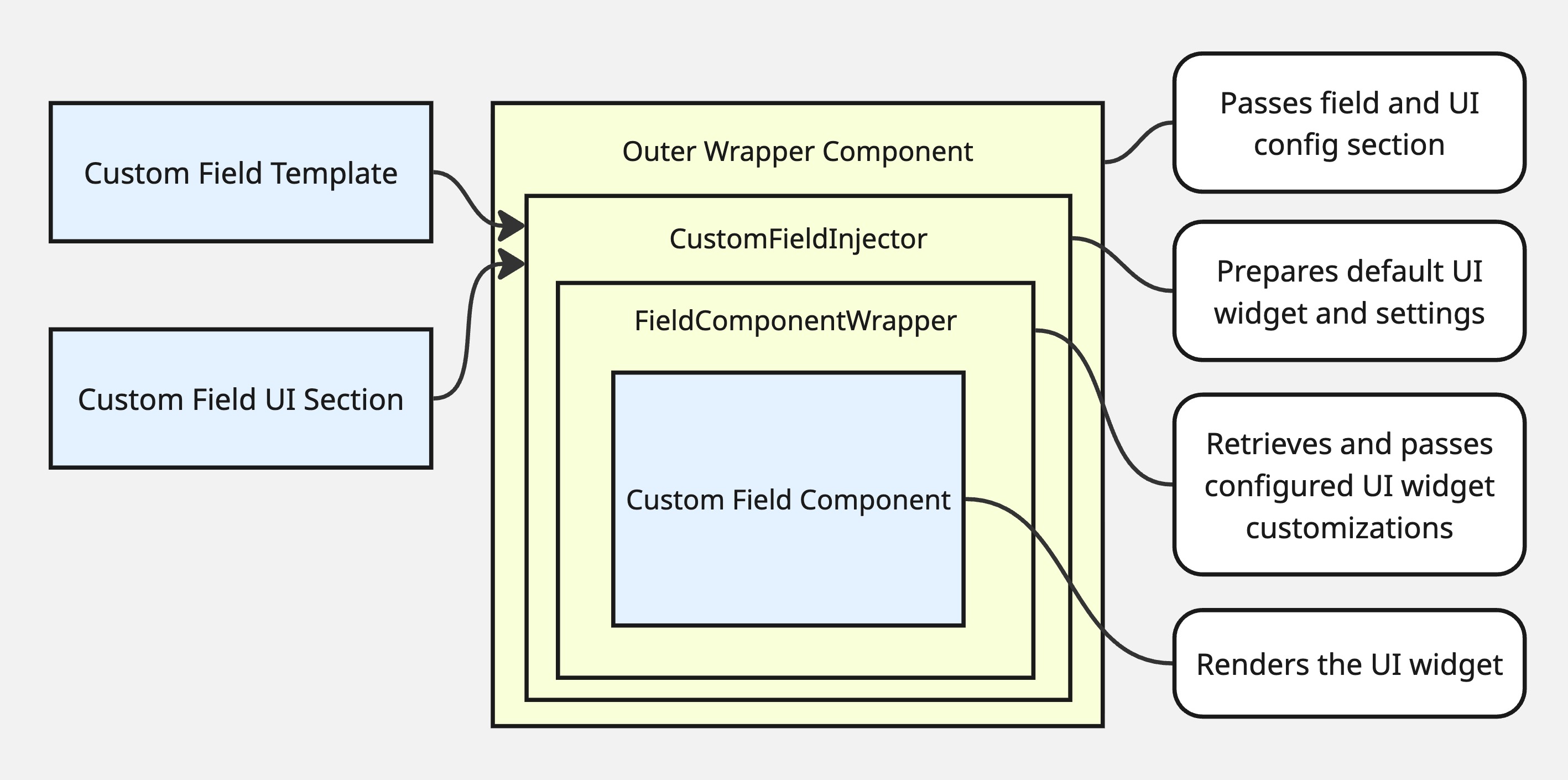 To free up custom field widgets for more flexible placement, use the CustomField component. It looks up the field’s widget and props from the same custom field UI configuration that is part of the regular InvenioRDM custom fields system (see Handling custom fields in Extending), does not mutate that config, and wraps the result in FieldComponentWrapper. This allows the field’s UI properties to be modified from the layout config and lets the widget adapt to the selected resource type.