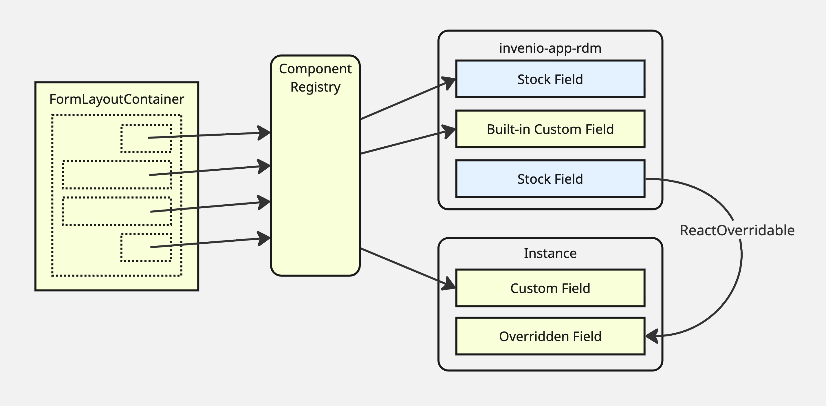 All of the stock field components are present in the combined registry by default. The stock components can also be overridden via the usual ReactOverridable method from your local instance directory. You can use your local instance component registry to add completely new custom form field components (e.g. compound components that combine multiple form fields in a single widget, or multiple components linked to the same underlying metadata field).