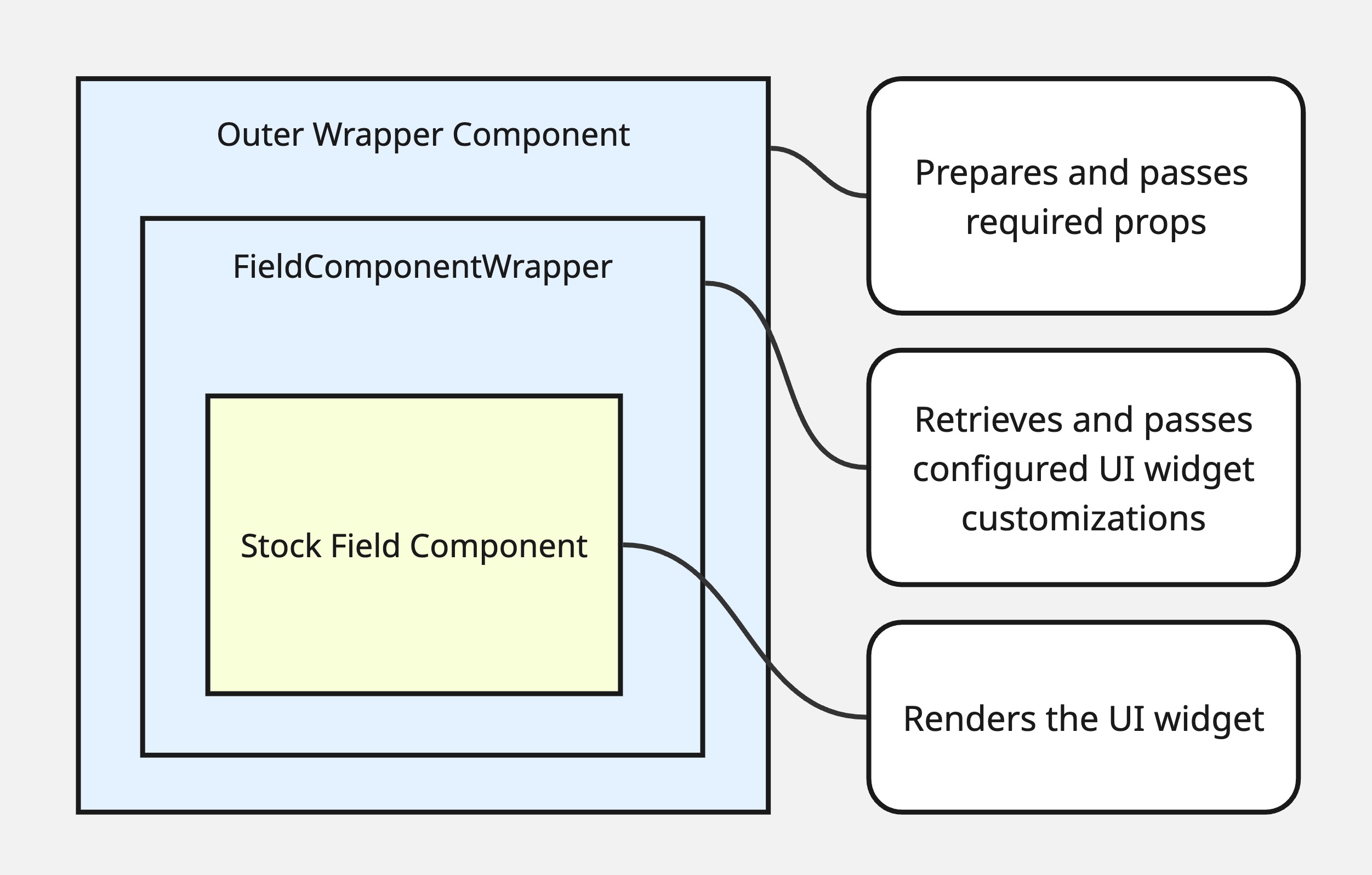 In addition, the field component is wrapped in an inner FieldComponentWrapper higher-order component. This retrieves any configured properties for the form field UI (label, labelIcon for the field label icon, placeholder, etc.), modified as necessary for the currently selected resource_type, so that field widgets can adapt to the resource_type on the fly without page reloads.